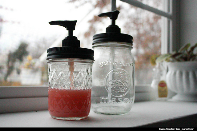 Instead of the traditional bottles of soap in your kitchen or bathroom, use leftover mason jars or jam jars to create unique containers. To create this, use the finished top off an existing soap dispenser and fasten it to your mason jar. Or you can completely start from scratch and drill a hole into the tin lid of your mason jar, unscrew the top of a plastic soap bottle, and use epoxy to secure it to the mason jar lid.