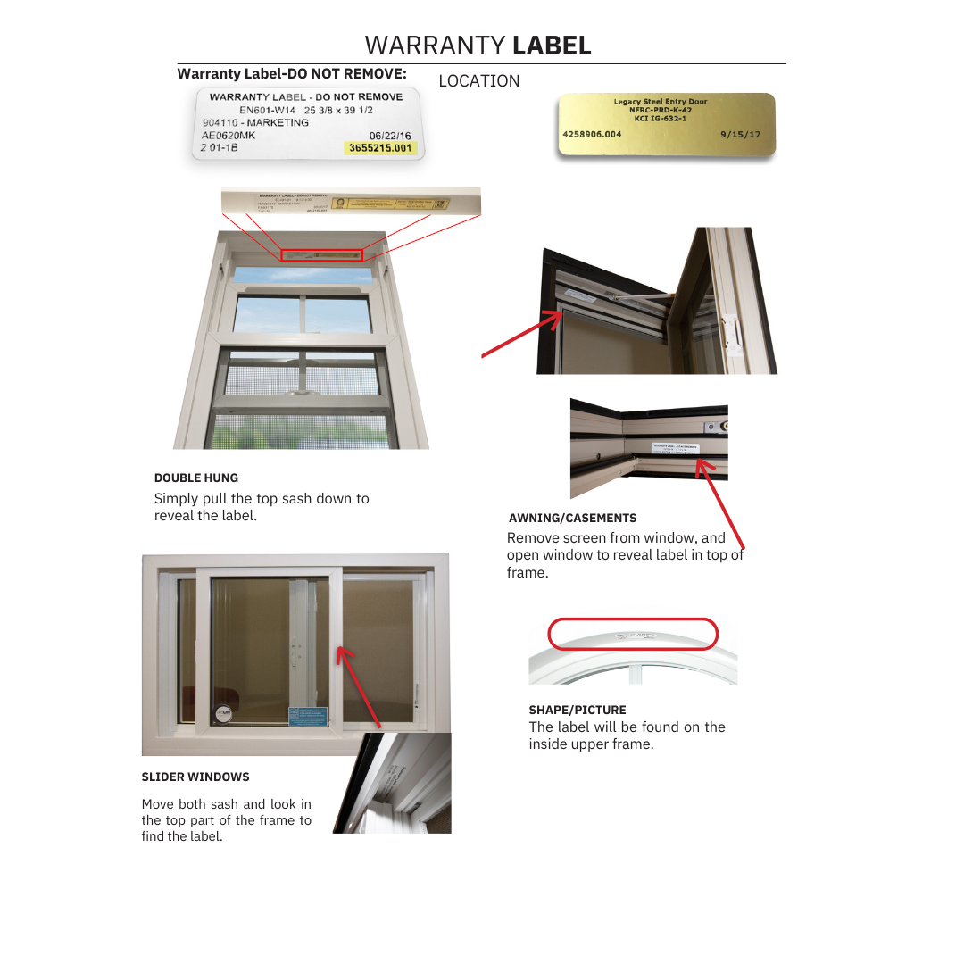 ProVia's warranty placement is a bit more tricky, as they also vary depending on the window type. Depending on which window type you have, be sure to check the top sashes, frames, and upper frames as well.