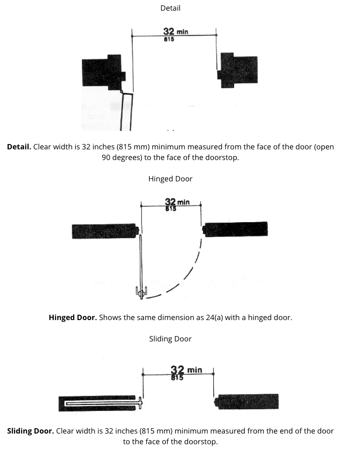 4.13.5 Clear Width. Doorways shall have a minimum clear opening of 32 in (815 mm) with the door open 90 degrees, measured between the face of the door and the opposite stop. Image Credit: ADA-Compliance