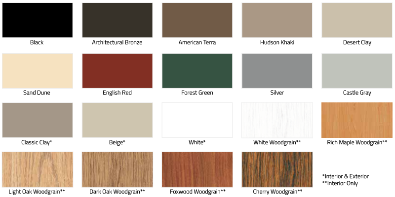 Polyurethane coating colors Alside aluminum window frames. The coating protects the base material from corrosion, weathering, abrasion. The vinyl window options are colored before molding. Silver, Sand Dune, and Black are the exterior colors that have recently been added to their collection. Your choices also include a vibrant English Red, a modern Castle Gray, and more.