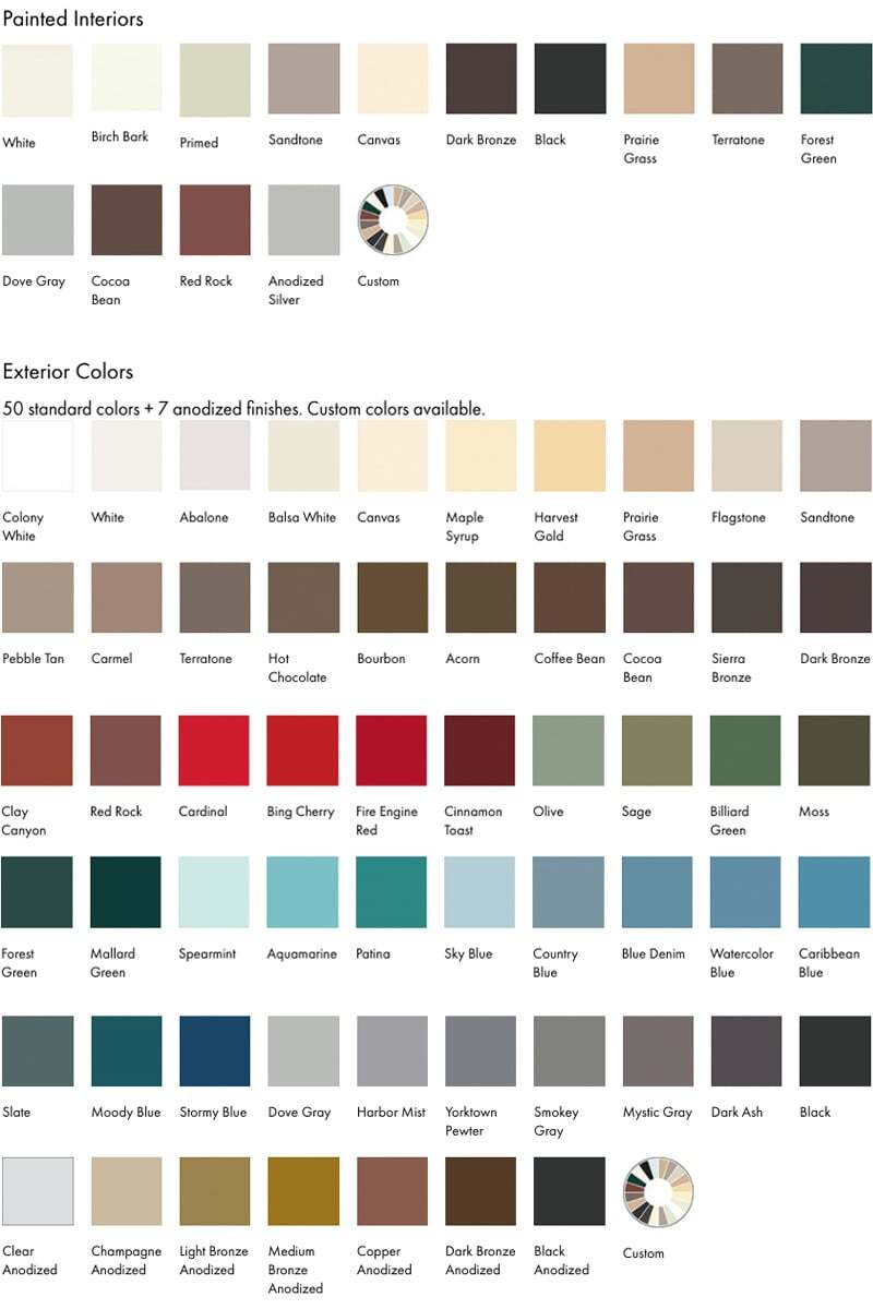 | Factory-Finished Stain Options: 9 options Painted Interiors: 14 options Exterior Colors: 50 standard colors + 7 anodized finishes |