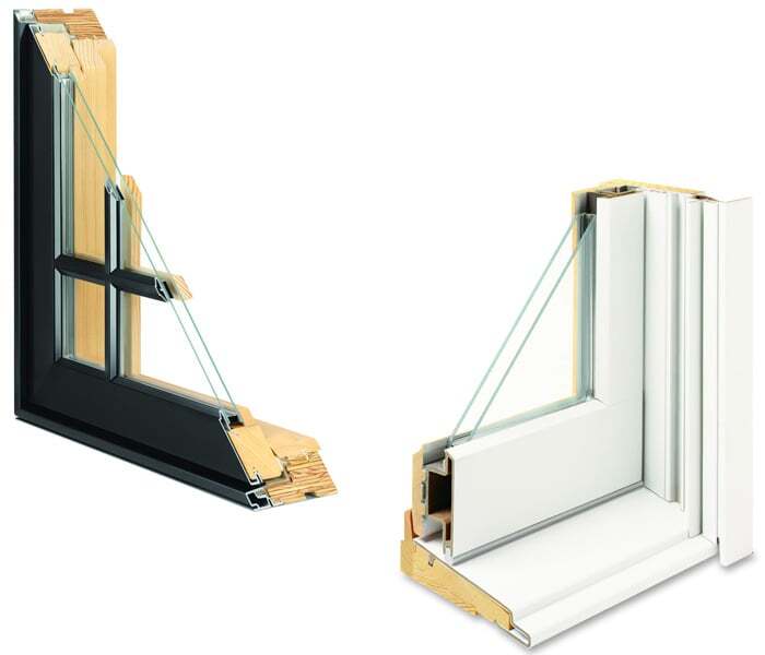 In this case, E-Series windows are wood windows with aluminum cladding. The exterior part of the window is covered in aluminum to protect the wood from damage that wood is typically susceptible to. As for 400 Series windows, they are made with wood interiors and vinyl exteriors. The images below show corner cuts of E-Series (left) and 400 Series (right) windows.
