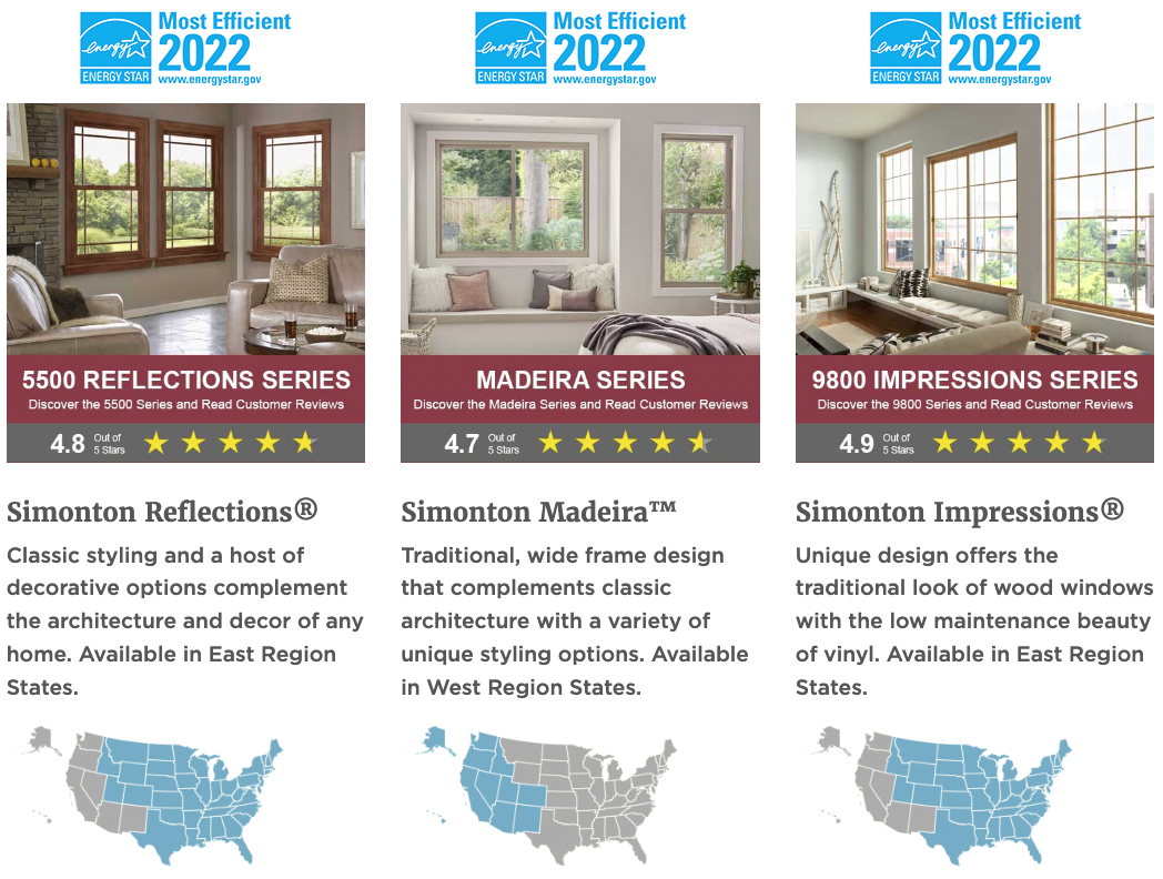Simonton does offer an extensive collection of windows that meet ENERGY STAR criteria. The ENERGY STAR program identified three types of Simonton triple-pane windows↗ as "Most Energy Efficient" products for 2022. Below are the names of the window series, along with the regions where they are available. Always double-check with your contractor or retailer that the window ratings do meet your local energy performance minimums as criteria vary from state to state.