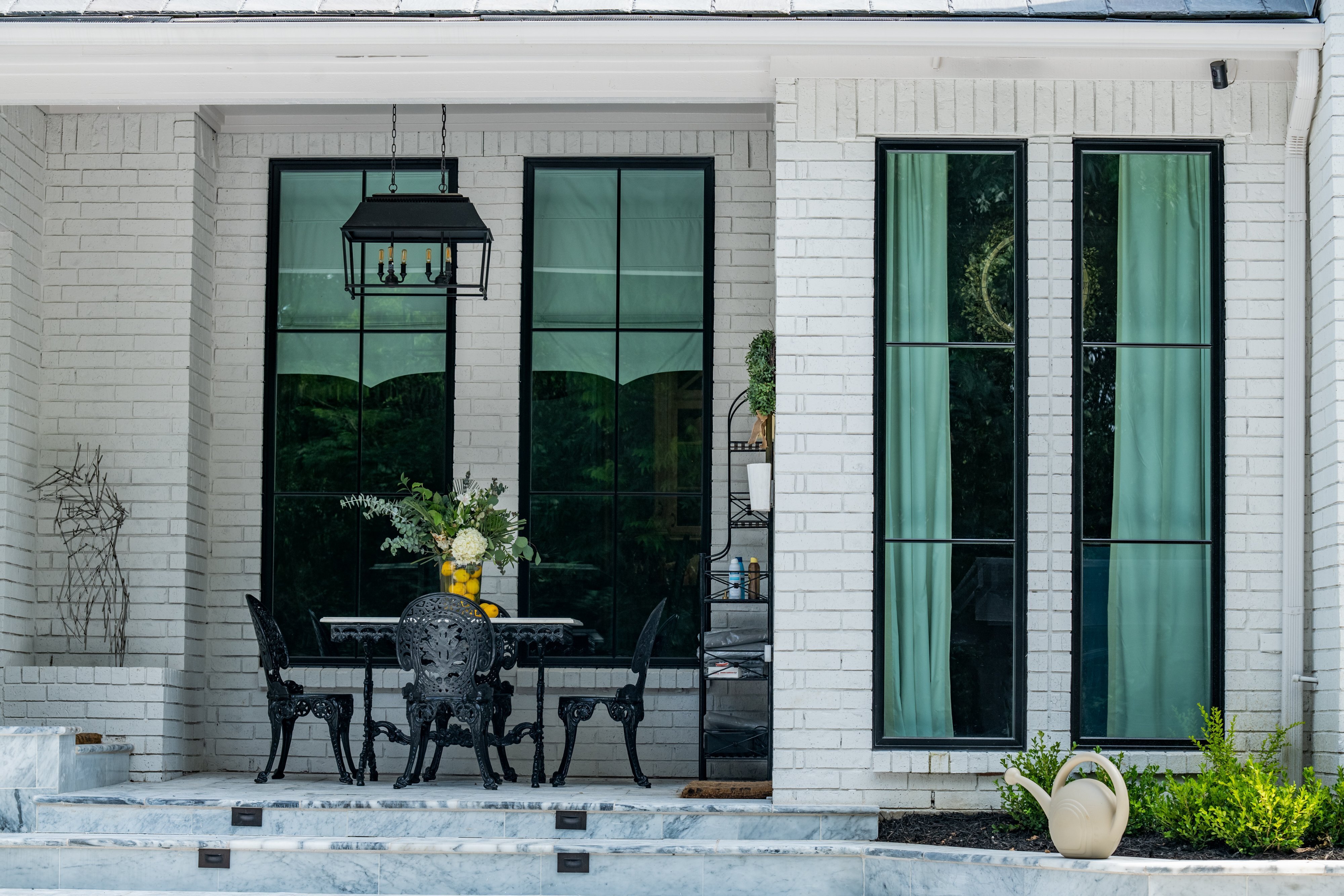 Staycation anyone? The black Andersen windows perfectly accentuate the marble patio and white brick facade.