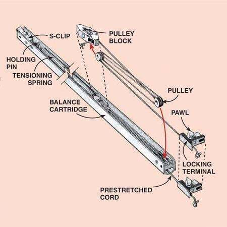 We’ll use the terminology from the graphic above to illustrate the parts of the block and tackle window balance. As you can see the channel or balance cartridge encases the balance system. In the image, you see a clip on the left, the “S-clip,” the clip is attached to a holding pin that is connected to a tensioning spring. The tensioning spring is connected to a pulley block with two pulleys and nylon or synthetic cord threaded through. One end of the cord is at the pulley block and the other runs through the locking terminal.