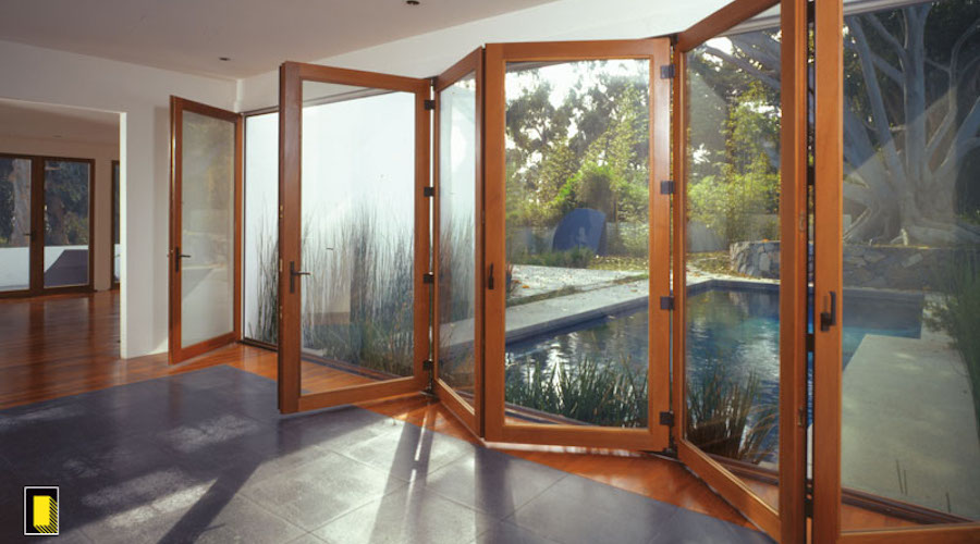 Exterior bifold doors look similar to bifolding closet doors and room dividers, but they're bigger, heavier, and more beautiful. This style has grown in popularity in residential applications among homeowners who value outdoor entertaining and want to create a smooth transition from indoor to outdoor living spaces. If you haven't seen them at one of your friends's house, you'll likely have seen them at a restaurant, bar, cafe, and even some stores.