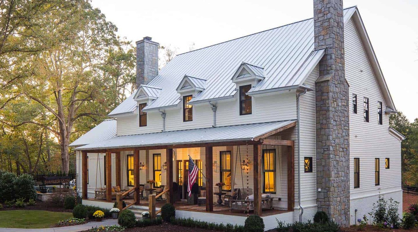 Search for #farmhousestyle↗ on Instagram, and you'll find a community of farmhouse style enthusiasts and their homes. With so many to chose from, it was challenging to select our top feature property. A favorite was a modern farmhouse in Massachusetts↗, with its board and batten sidings, metal roof, and front porch. The carriage-style farmhouse garage doors are also a typical characteristic often used in modern farmhouses to emulate a simpler time with horse-drawn carriages.