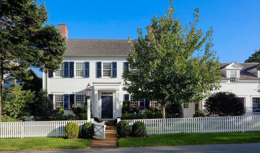 Patrick Ahearn Architects created a modern interpretation of a Federal Colonial Style↗ home in the historic district of Edgartown, Massachusetts. This beautiful contemporary home displays the typical symmetry that is quintessential of Colonial-style homes. The embellishments are free of grotesque antiquity and instead exudes elegance within its use of Roman-inspired pillars and frieze above the main entrance.