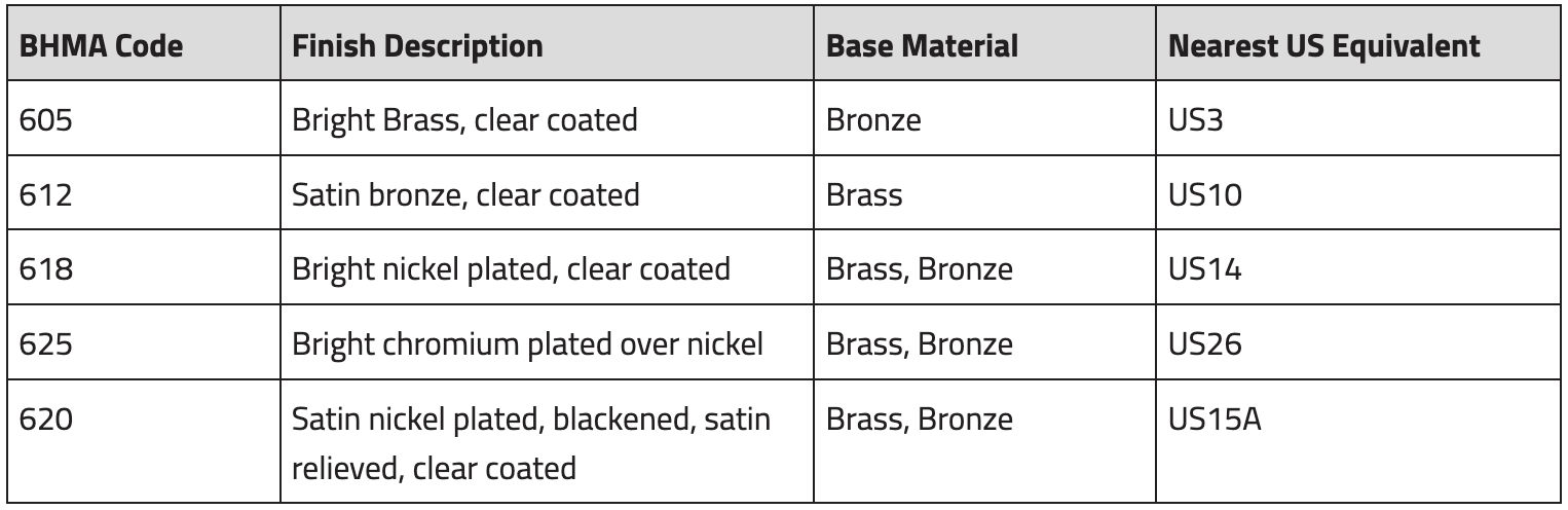 Door companies and manufacturers who sell door hardware may change the name of their color finishes to sound more alluring to customers, but in the U.S., two finish code systems standardize colors. The two systems are the Builders Hardware Manufacturers Association codes (BHMA) and the American National Standards Institute (ANSI) U.S. standard finish codes8. Below is an example table with ANSI/BHMA finish codes, descriptions, and equivalent finishes9.