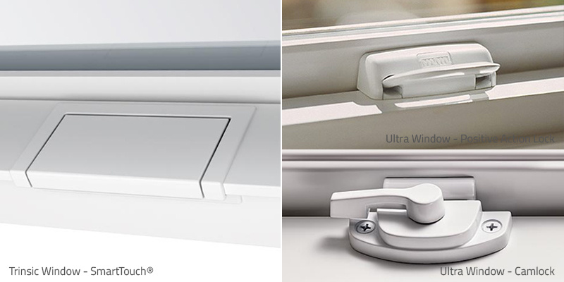 Milgard Trinsic and Ultra windows have different window lock options. Trinsic windows feature easy-to-operate SmartTouch® locks with a sleek, low-profile design and Ultra windows are available with cam locks or Positive Action locks.