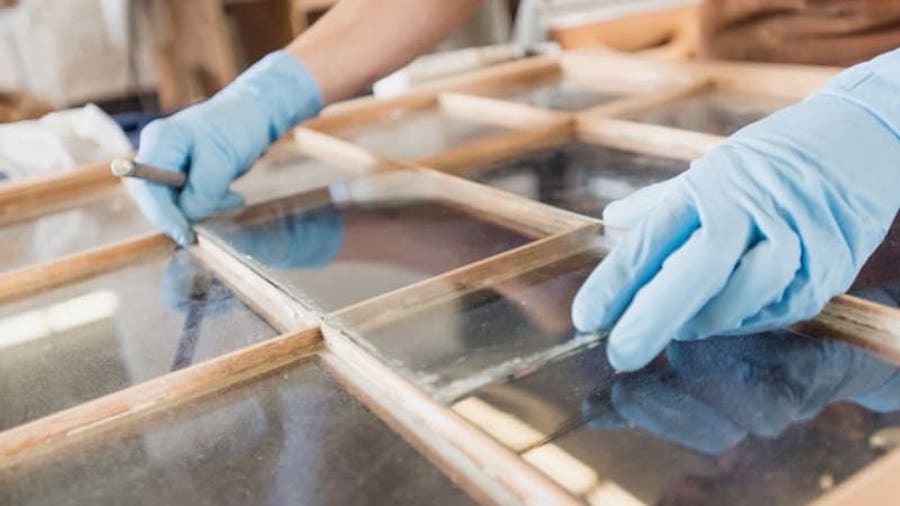 As a note, the home in the photo above has single pane metal windows with muntins. In the photo below you can see how glass is removed from between the muntins before the window is replaced.