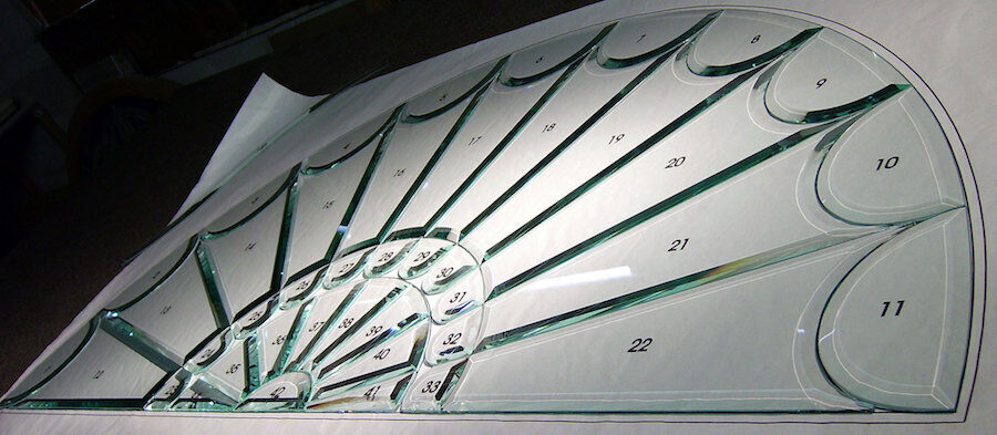 Beveled glass was originally painstakingly created with a rotating wheel of stone or a textured metal like cast iron. When the edges were ground down, it was done slowly to ensure the correct angle around each piece. At the same time the wheel was rotating, the glazier would use what is called a slurry made of sand and water. Texture working against texture was a significant factor in high-class production.